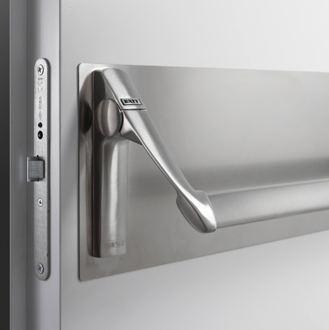 Paniekbalken en panieksluitingen voor nooduitgangen, volledig geïntegreerd in de branddeur.